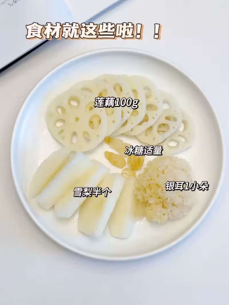 蓮藕100g、雪梨半個、銀耳2小朵、冰糖適量。全部放進破壁機,加700ml水,選豆漿模式,打好就可以直接喝了。