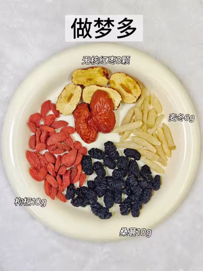 1、準備桑葚干10g➕枸杞10g➕麥冬6g➕紅棗3顆