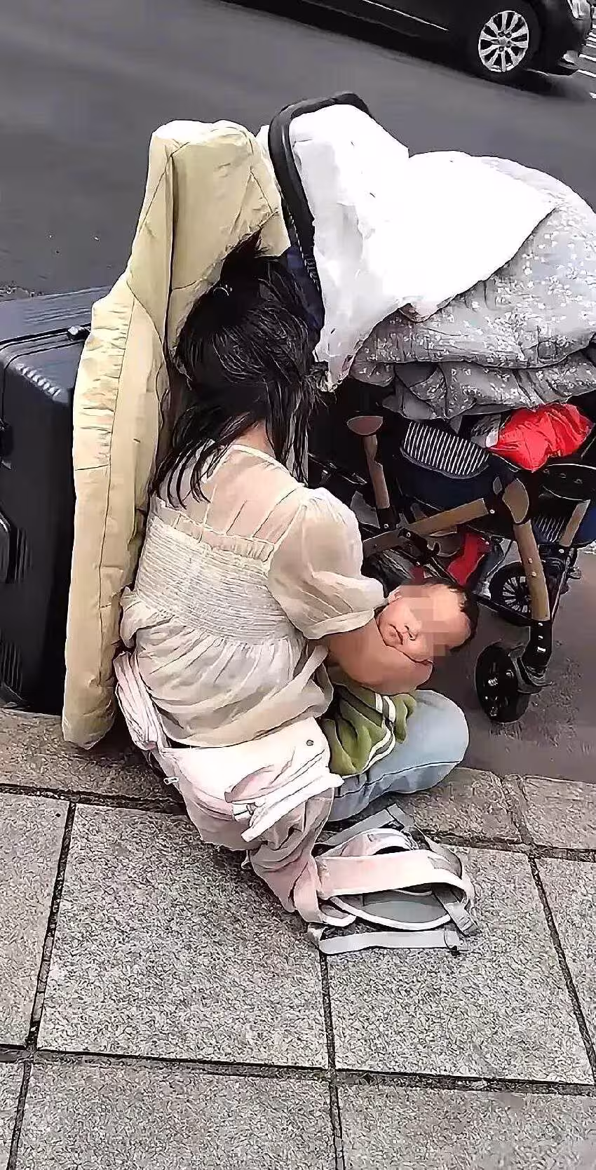 母親似乎察覺到了什麼,把行李往身上踢了一腳,身體側過去,像是要擋住孩子的臉。