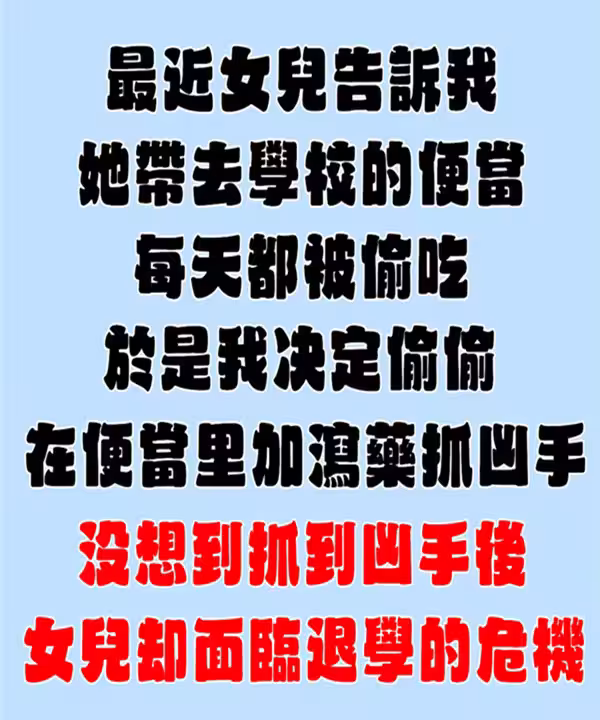 最近女兒告訴我,她帶去學校的便當每天都被偷吃,於是我決定「偷偷在便當里加瀉藥...」抓兇手,沒想到「抓到兇手後」女兒卻面臨退學的危機...