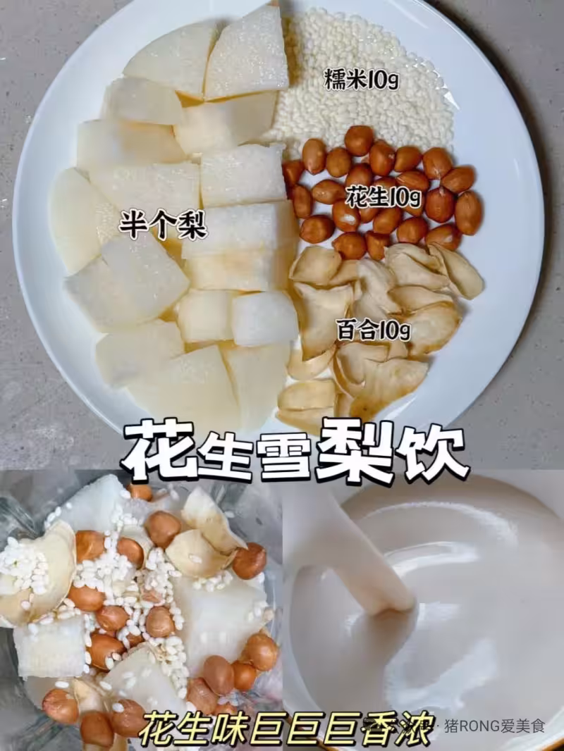 4️⃣花生雪梨飲:半個梨+糯米10+花生 10g+百合10g +加水 破壁機水位線600ml位置