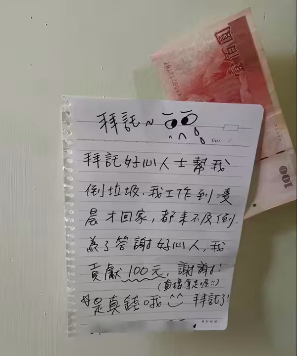 沒時間倒垃圾!!她在門口「留紙條+百元鈔」請鄰居幫倒,隔天回家一看愣住了:是我太天真