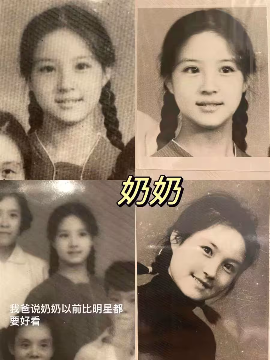 從圖片來看,奶奶年輕時梳著雙麻花辮,清純又端莊,眉眼之間流露著那種不施粉黛卻充滿風韻的氣質。「當時的攝影技術有限,但奶奶看起來完全像是從黑白電影里走出來的女主角。」女孩寫道。