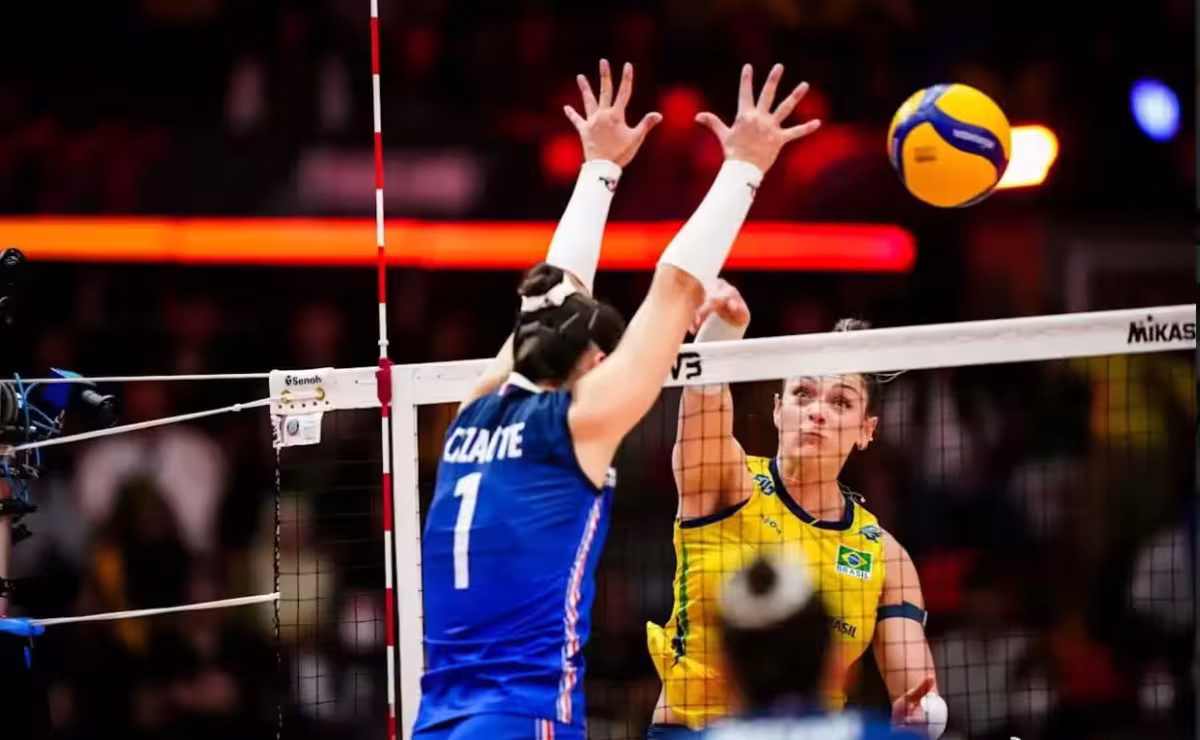 首局比賽兩隊進入狀態都比較快,巴西的一次攻比較流暢,7-4領先,法國的進攻有些受阻,巴西連續得分,把控細節更出色,10-5拉開比分,法國打響反擊,進攻有起色,不斷追近比分12-13,並且成功追平16-16,巴西背飛命中,局末階段廝殺到20-20,法國22-21反超,兩隊都在拼發球,相比之下,巴西的一傳更穩定,關鍵分巴西攔網得分,抓住了巴西的弱輪,加比的進攻打出了經驗,最終巴西27-25險勝。這局巴西在發扣攔都稍贏法國,失誤多法國2個。