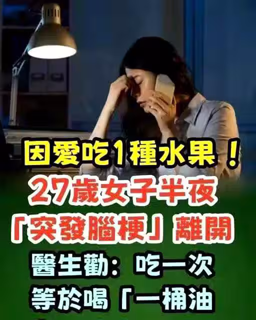 因愛吃1種水果 !27歲女子半夜「突發腦梗」離開了, 醫生勸勸:吃一次等於喝「 一桶油」