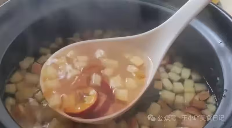 4.下鍋煮:把蘋果丁和山楂一起放進鍋里,加清水沒過食材,大火燒開後轉小火燉 10 分鐘。