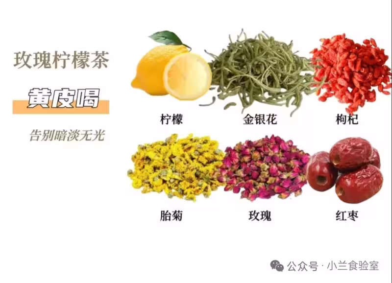 ▫️配方:玫瑰10g + 檸檬片3片 + 金銀花5g + 枸杞10g + 胎菊5g + 去核紅棗4顆