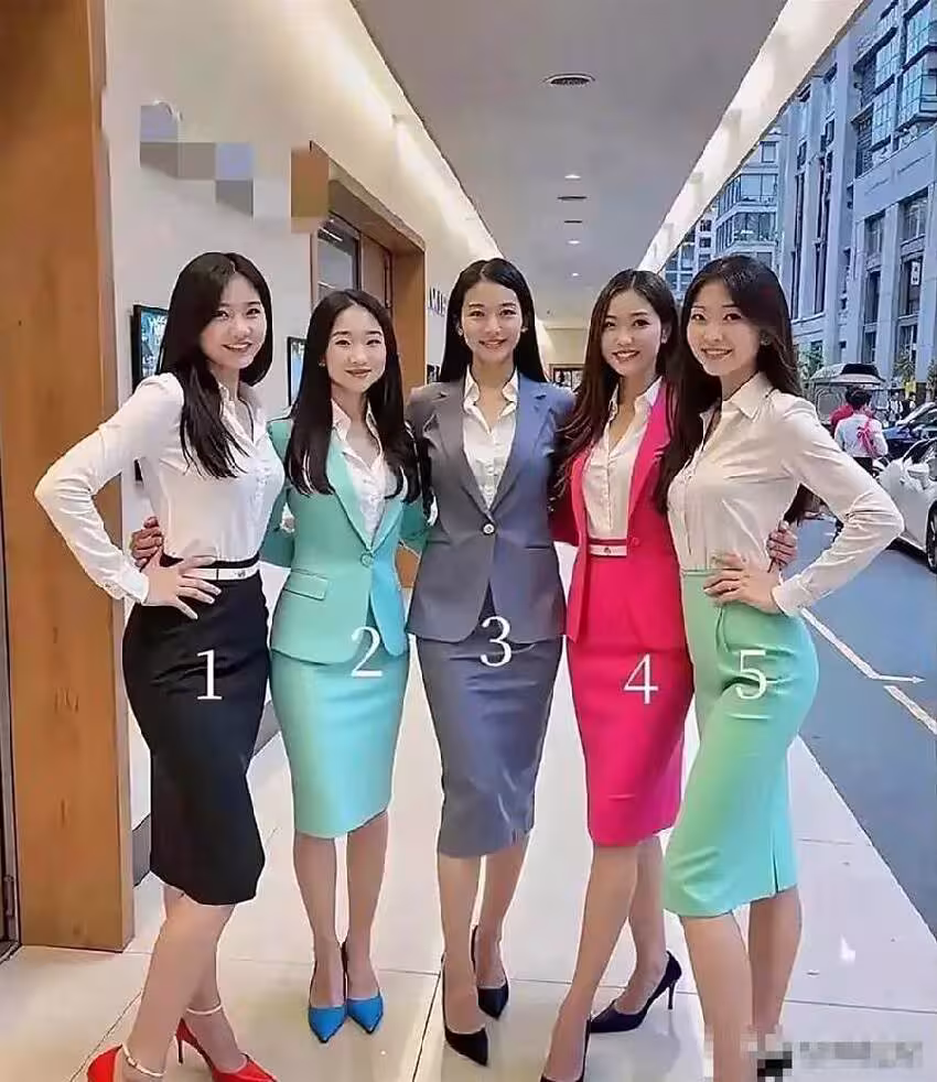 照片中,五位女士分別穿著黑色、青色、灰色、粉色和綠色的套裝,每人都展現出自信和優雅。
