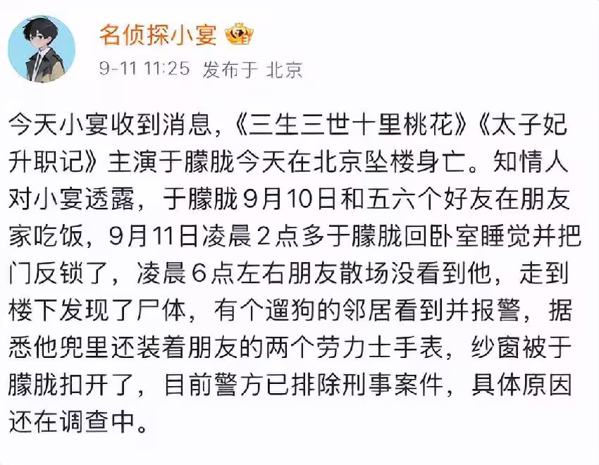 9月11日,狗仔發文爆料,稱於朦朧在11日凌晨從朋友家墜樓身亡,當晚他在朋友家吃飯,凌晨2點多以睡覺名義將自己反鎖在臥室里,清晨6點飯局散場時朋友們沒有見到他,反而是在樓下發現了於朦朧的屍體。