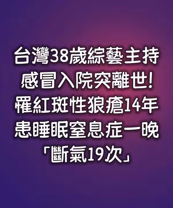 台灣38歲綜藝主持,感冒入院突離世!罹紅斑性狼瘡14年 患睡眠窒息症一晚「斷氣19次.」