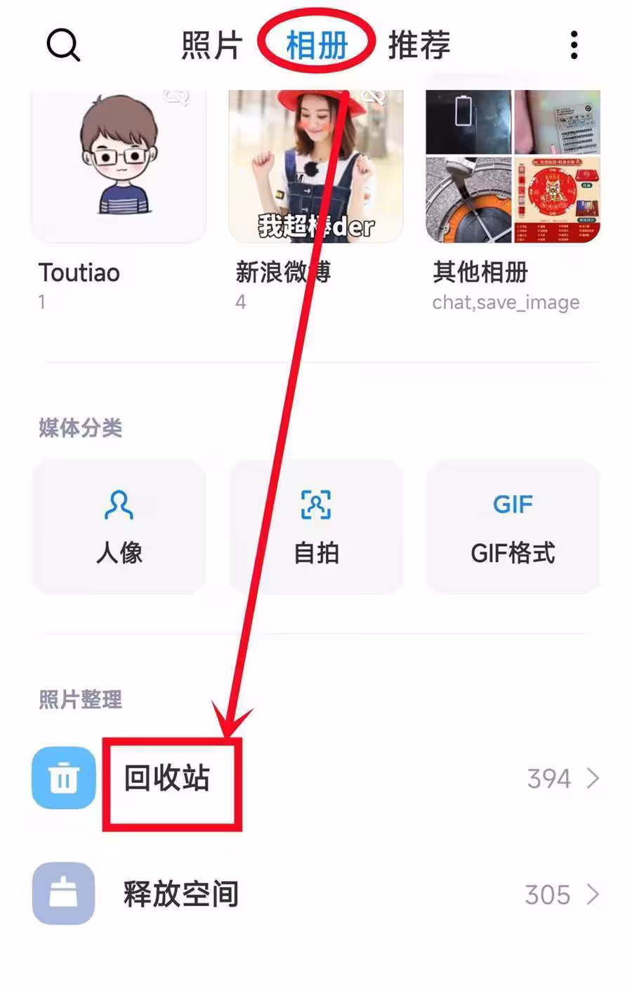 首先當我們不小心把照片刪除了,此時我們需要打開手機上面的相冊,打開之後,點擊中間的相冊,然後往下滑動,接著可以看到在下面有一個回收站