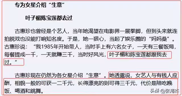 據古惠珍爆料,行情最好時,連「波霸」葉子楣和「一代艷星」陳寶蓮都經常跟著她去參加飯局。