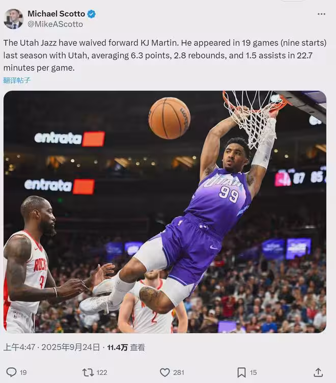 9月24日,據NBA記者Michael Scotto報道,猶他爵士隊正式裁掉小肯揚-馬丁,他將進入自由市場尋求新的機會。目前並沒有球隊表達出對小馬丁的興趣,他很難找到下家。小馬丁原有合同還剩1年800萬美元,完全無保障。