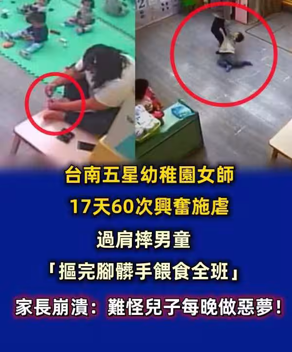 台南五星幼稚園女師17天60次興奮施虐,過肩摔男童「摳完腳髒手餵食全班」家長崩潰:難怪兒子每晚做惡夢!