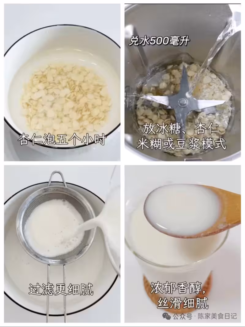 將泡好的杏仁、冰糖一起放進破壁機中,加500毫升清水,選擇豆漿或米糊模式,打成杏仁汁。