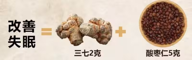 功效:酸棗仁中的皂苷和生物鹼具有鎮靜安神作用;三七通過降低血液粘稠度、促進腦部供血,幫助改善因氣血不足導致的失眠頭暈症狀。