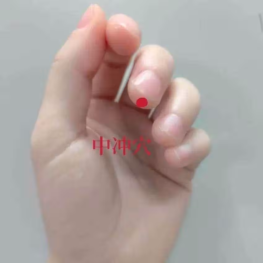 中沖穴在手中指末節尖端中央,有心慌時,可用拇指指腹按壓中沖穴,力度要適中,每次5分鐘,每日2次。