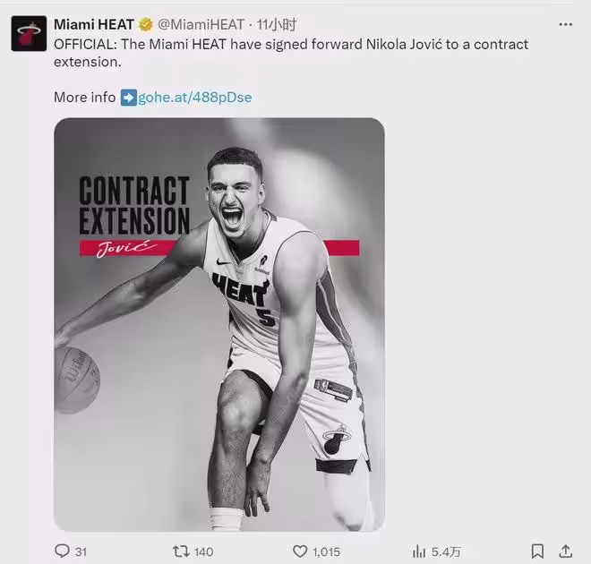 熱火官方宣布:球隊正式續約尼古拉-約維奇(Nikola Jović)。另據NBA名記Shams報道,這份合同是4年6240萬美元,全額保障、沒有任何選項。目前約維奇是4年1150萬美元的新秀合同,2026年夏天到期,還剩1年445萬美元。