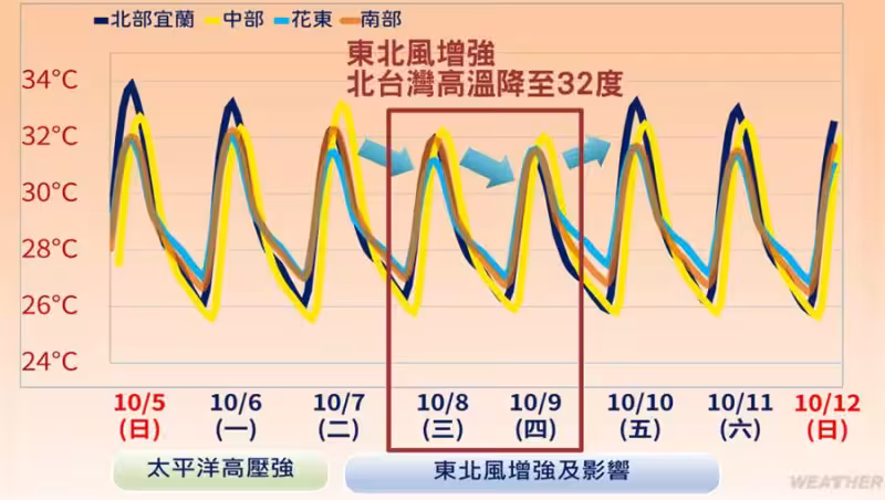 不過,因颱風外圍環流關係,台灣變天下雨,6縣市雨最大,包括:台北、新北、基隆、宜蘭、花蓮、台東。氣象署表示,由於哈隆颱風外圍環境帶來東北風和水汽影響,周三(8)~周五(10)迎風面大台北、基隆北海岸、東半部地區及恆春半島有局部短暫陣雨。