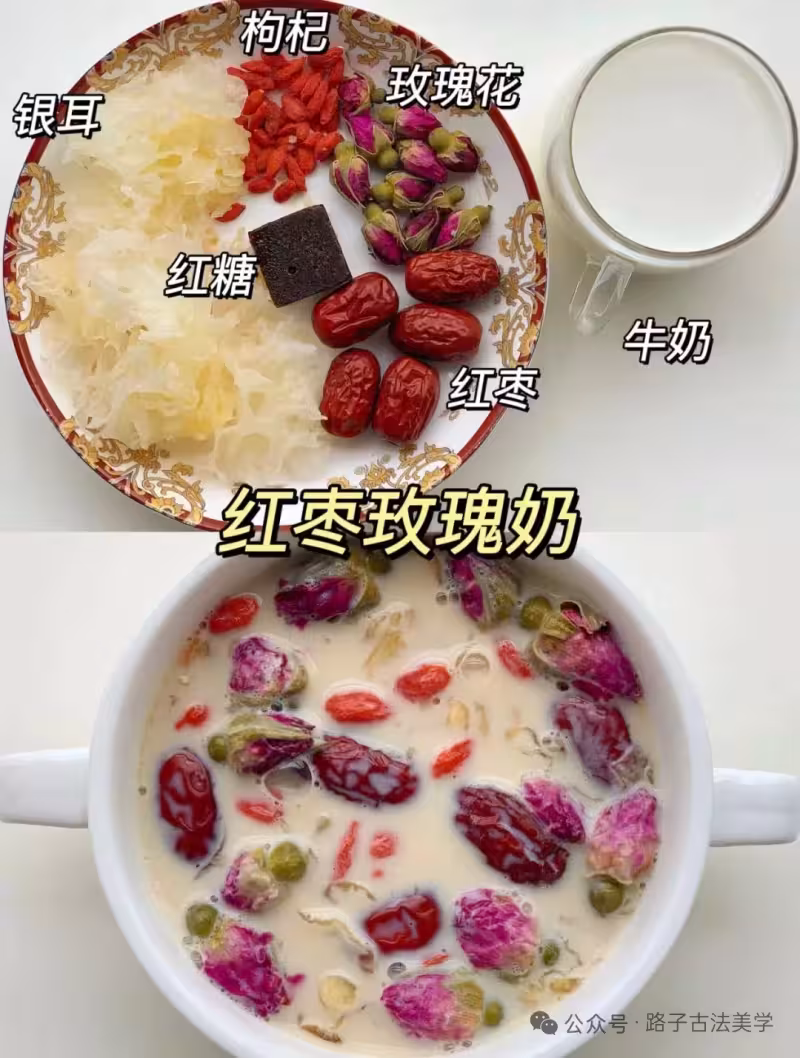 銀耳、紅棗、玫瑰花、牛奶、紅糖、枸杞