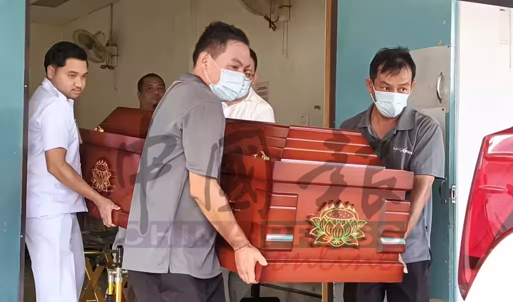 裝有李文瀚遺體的棺材,在殯葬工作人員及太平間工作人員合力下,抬上靈車。