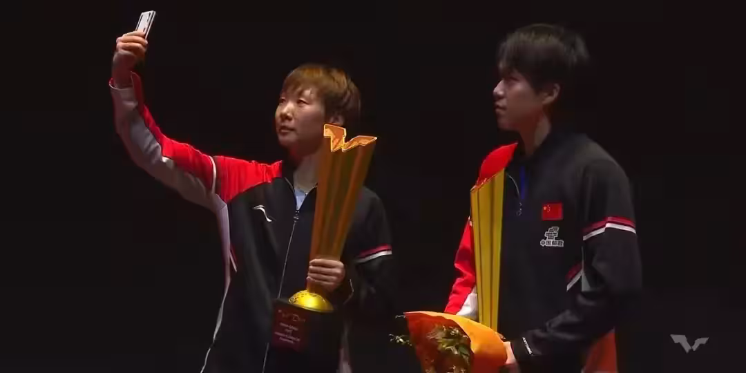 而在和小石頭合影的時候,場面更是有趣,小石頭本來以為長胳膊的哥哥會拍照,可是王楚欽直接努嘴示意工作人員把手機給到了小石頭,而當小石頭一手獎盃,一手花,不知道怎麼接手機的時候,王楚欽很「貼心」的幫他拿過花,就躲在小石頭身後,小石頭也是滿滿的無奈。