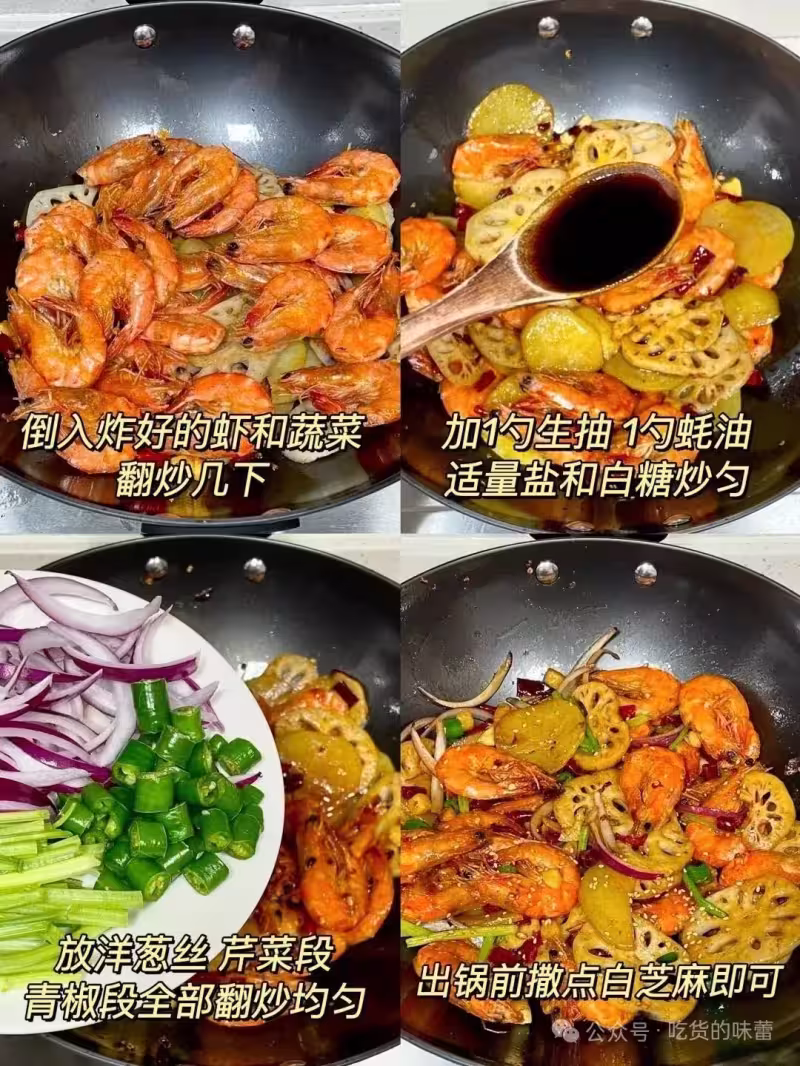 2、鍋里留底油放姜蒜粒,干辣椒段炒香,加一小塊火鍋底料炒出紅油,倒入炸好的蝦和配菜,加1勺蚝油,1勺生抽,適量白糖和鹽調味,再放洋蔥絲、芹菜段和青椒段翻炒斷生,出鍋前撒上白芝麻即可