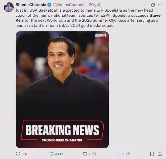 10月11日,據NBA名記Shams報道,斯波爾斯特拉接替科爾,成為美國男籃新一任主教練,率隊征戰2027年籃球世界盃和2028年洛杉磯奧運會。科爾在2021年成為美國男籃主帥,率隊出戰了2023年世界盃和2024年奧運會。