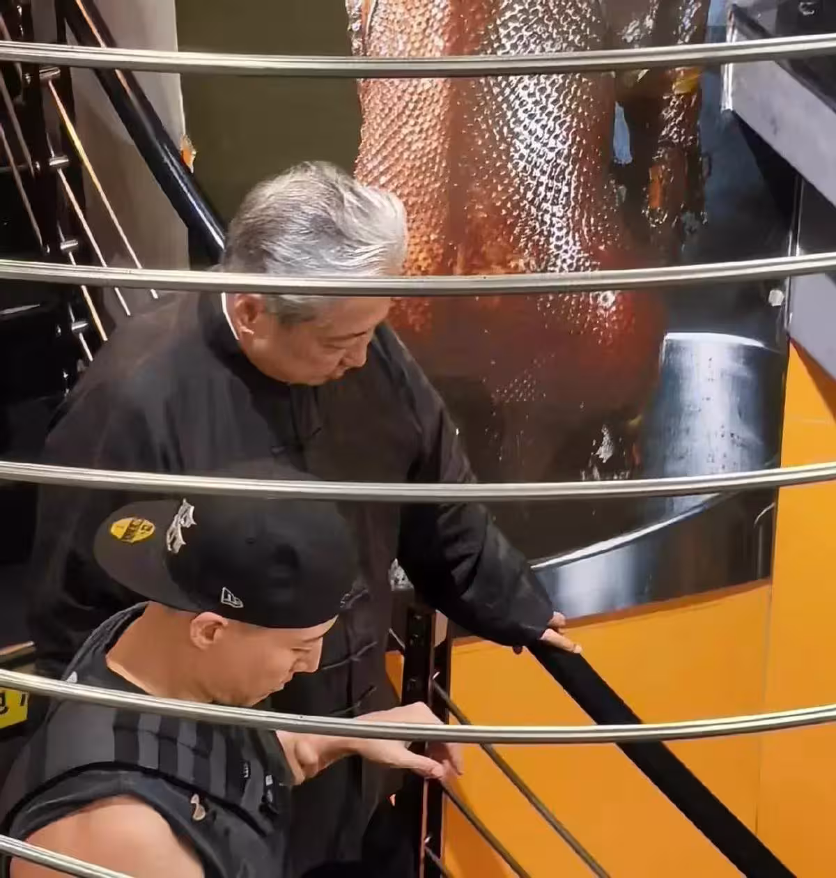 視訊里,洪金寶穿了一件黑色的中式褂子,衣著很簡單,完全不像個「超級巨星」的派頭。仔細一瞧,七十多歲的他頭髮已經幾乎全白,腿腳有些不太靈便,走路時需要身邊人小心攙扶。