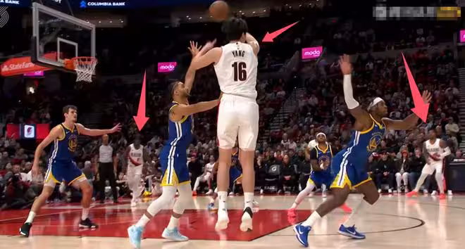 後面小楊甚至變成魔術師了,接下來他又秀了一個更神的精彩傳球,因為他打得越來越好,教練給他的信任越來越多,楊瀚森在三分線外也能處理球了。他面對勇士後衛的防守,從外面直接運著往裡打,吸引了勇士隊雙人包夾,然後突然高高跳起,在半空當中扭頭看向了遠處的隊友夏普。