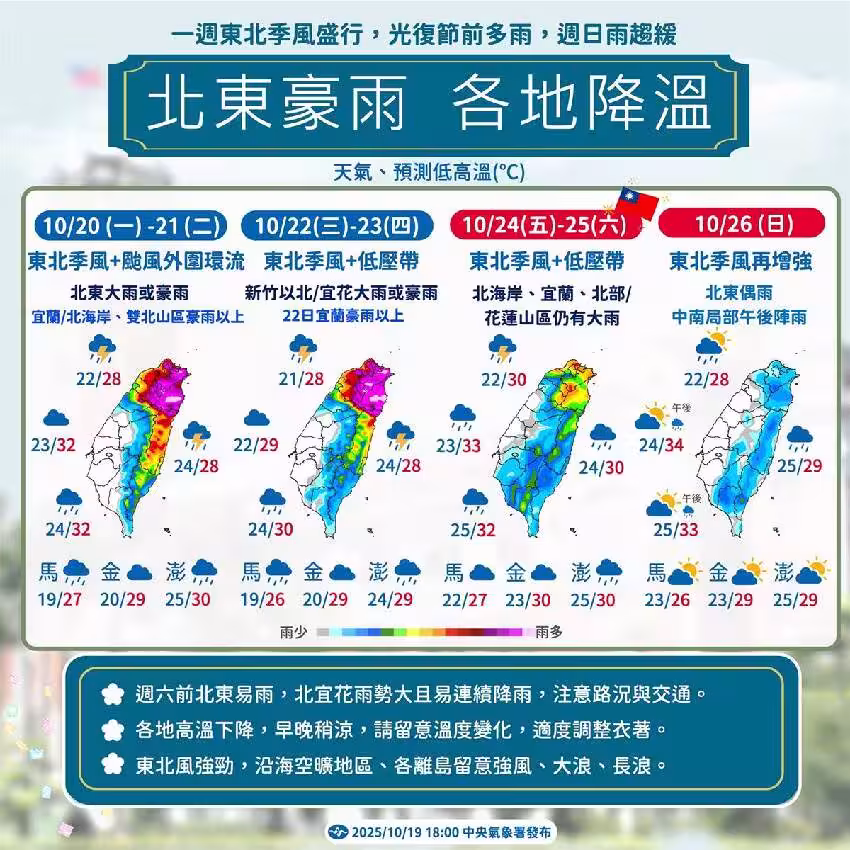 氣象署表示,周三至周六東北季風及低壓帶影響,基隆北海岸、東北部及新竹以北山區有陣雨,並有局部大雨或豪雨機率,其中周三東北部有局部豪雨等級以上降雨機率,東部有短暫陣雨,並有局部大雨機率,北部、東南部及中南部山區有局部短暫陣雨。
