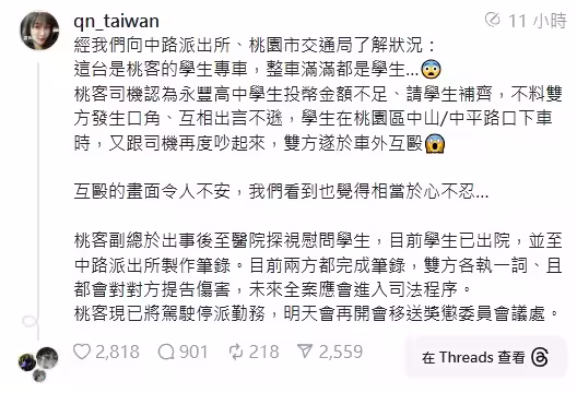 桃園客運副總立即趕赴醫院探視受傷學生,目前學生已順利出院。