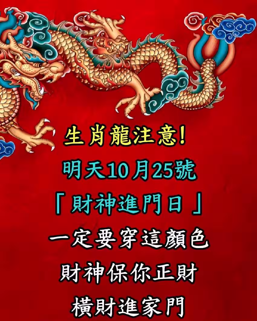 10月25日農曆九月初五「財神進門日」招財秘法:穿對顏色,旺足一整年!明日即將迎來今年最重要的招財吉日之一——農曆九月初五「財神進門日」!對於生肖龍的朋友來說,這一天更是能量爆棚的轉運時刻。