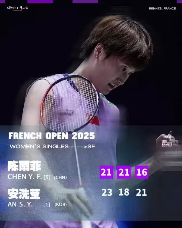 北京時間10月25日,2025年法國羽毛球公開賽女單半決賽,陳雨菲1-2惜敗安洗瑩,三局比分:21-23、21-18、16-21,這場比賽後安洗瑩晉級決賽,世界第一安洗瑩也在世錦賽女單半決賽不敵陳雨菲後完成了復仇,這場比賽鏖戰87分鐘兩人的體能都到達臨界點。