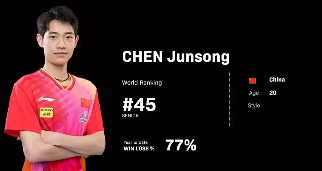 2005年出生的陳俊菘成為本期最大亮點。憑藉中國大滿貫男單八強(擊敗張本智和、濱田一輝)的突破,其排名從第113位飆升至第45位,單周飆升67名創生涯新高。這位福建小將以左手橫拍、反手生膠的罕見打法著稱,球路低平下沉的「另類弧圈」令對手難以適應,被日本媒體稱為「張本智和剋星」。