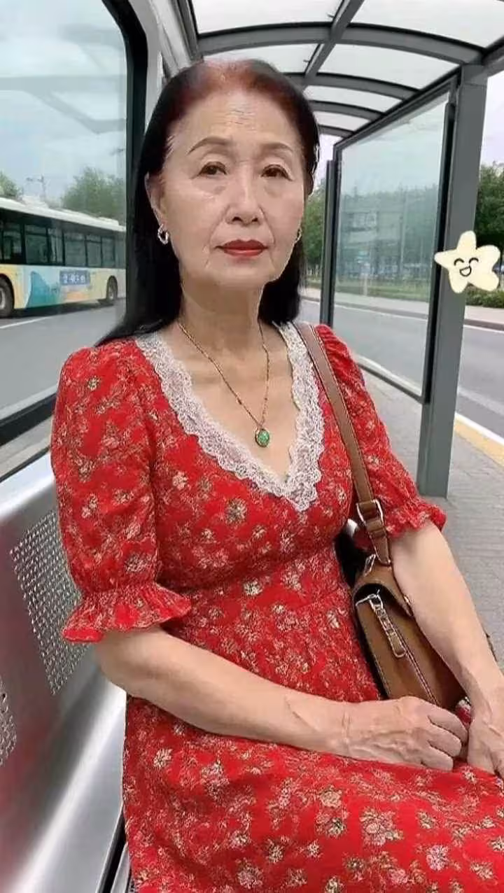 照片主角是一位「70幾歲的阿姨」,她身著「紅色的裙子」 ​​,風格被形容為「20幾歲的穿搭」 ​​。