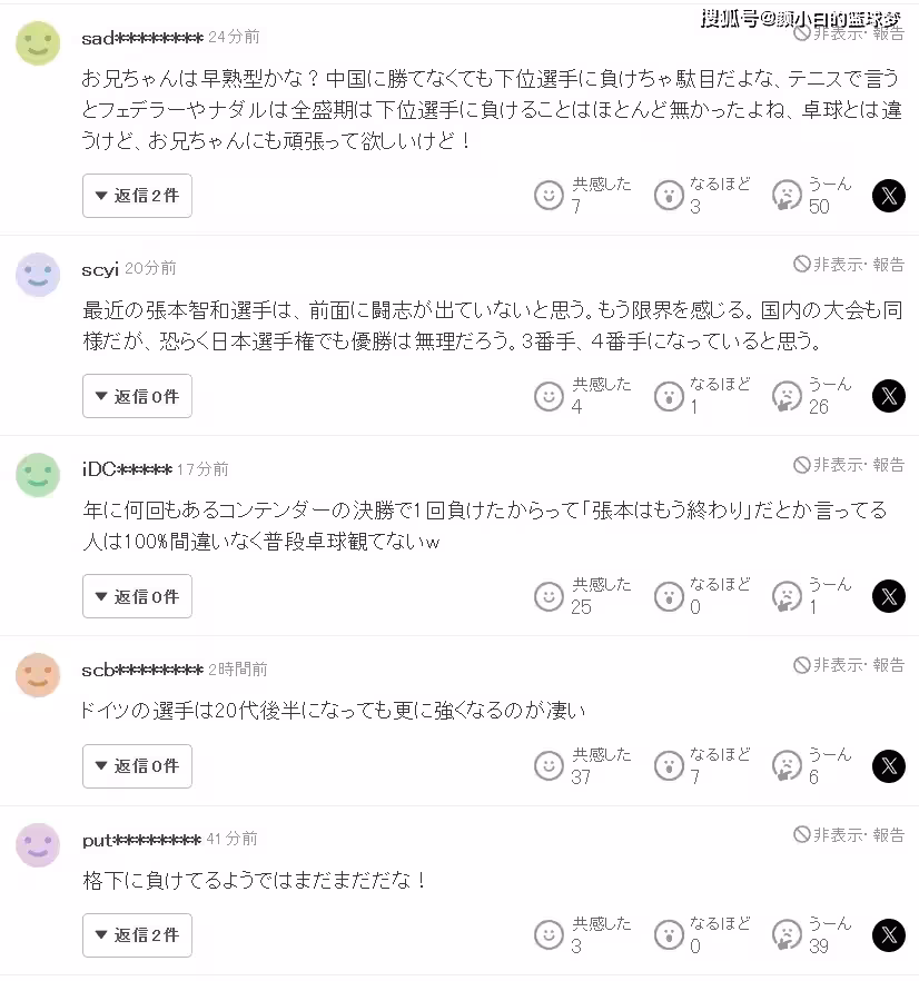 2.我覺得最近的張本智和選手根本沒有鬥志,感覺他上限已定。國內的大賽也沒有多好,恐怕全日本錦標賽也無法奪冠,他應該變成第三、第四選擇;
