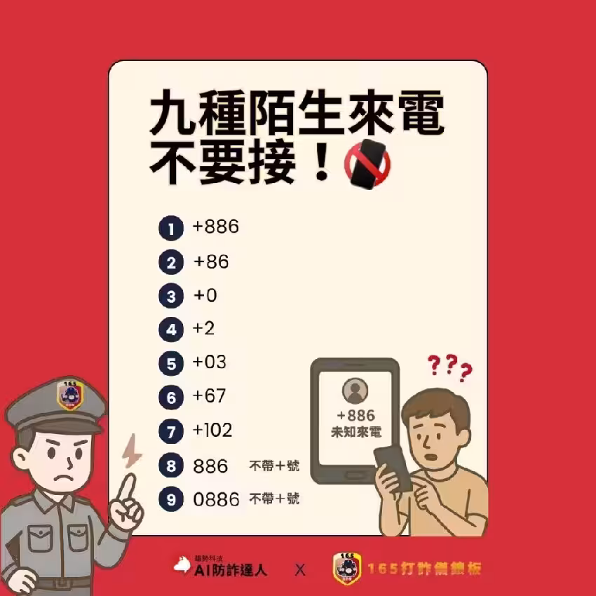 根據媒體《ETtoday新聞雲》、《TVBS》的報導,蘆竹分局日前在臉書粉專發文提醒民眾,務必提防開頭為+886、+86、+0、+2、+03、+67、+102、886、0886的陌生來電,因為這些很可能就是詐騙電話。