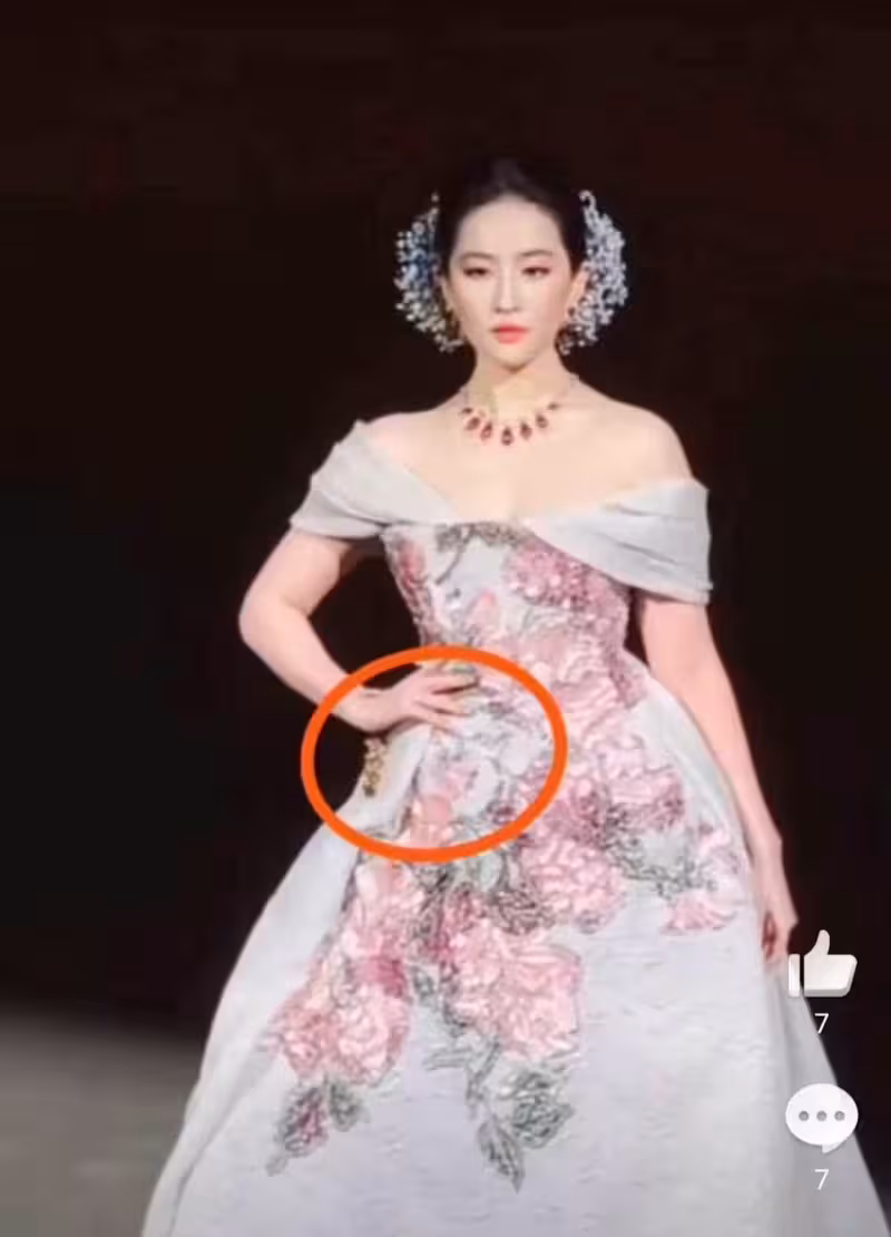 晚會現場眾星雲集,劉亦菲身穿米白色平口高雅禮服壓軸登場,露出絕美的肩頸線條及雪白肌膚,搭配奢華高級的紅寶石項鍊、耳環。走秀時禮服上的花朵刺繡隨著她步伐緩緩綻放,沒想到她手腕佩戴的手鍊突然斷裂,她火速用無名指接住手鍊以防滑落。