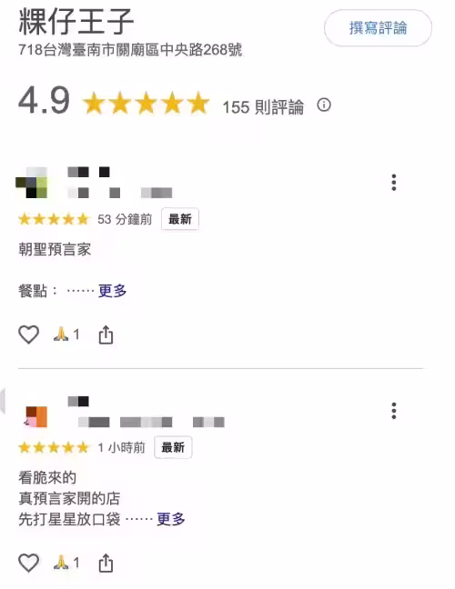 近日藝人粿粿與王子(邱勝翊)傳出婚內出軌,網絡上出現許多迷因哏,位於台南關廟、店名恰好為「粿仔王子」的美食,也因為這起風波事件,突然爆紅成為粉絲關注的焦點,許多人紛紛湧入Google地圖評論區,直呼店名是「神預言」,還有粉絲特別在網絡上籤到朝聖,指出這邊可以正大光明吃粿仔。