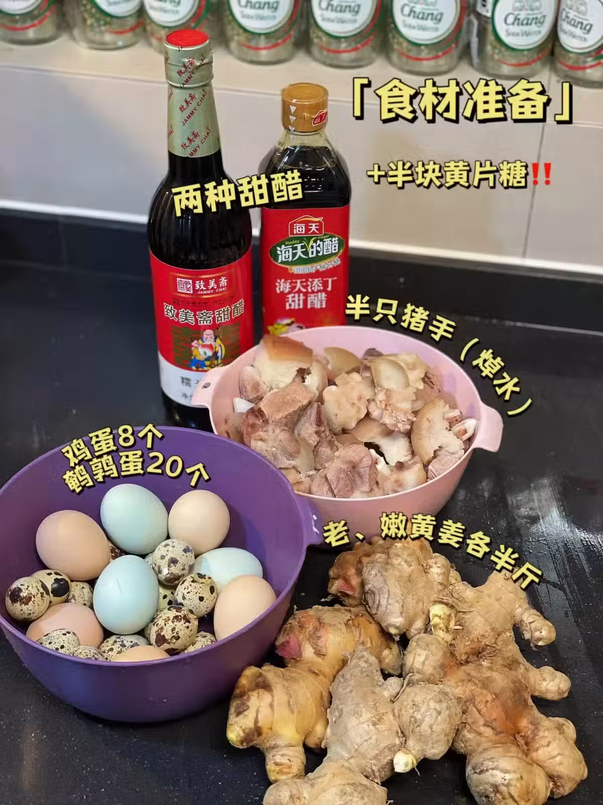 1、黃姜去皮,拍塊/切厚片,熱鍋後直接炒至微焦(無需放油),轉至沙鍋,加甜醋煲20分鐘