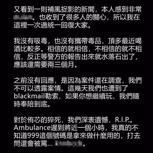 「台灣女網紅謝侑芯在馬驟逝」案;大馬著名歌手黃明志首度發聲,駁斥有關被指擁毒和濫用毒品的指控。