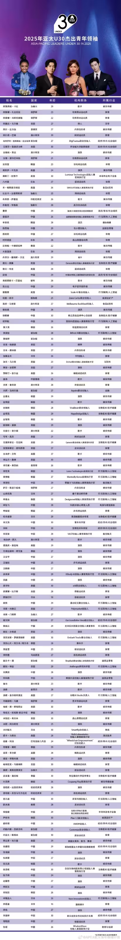 __王楚欽、鄭欽文、張雨霏等入選2025亞太U30傑出青年領袖榜單