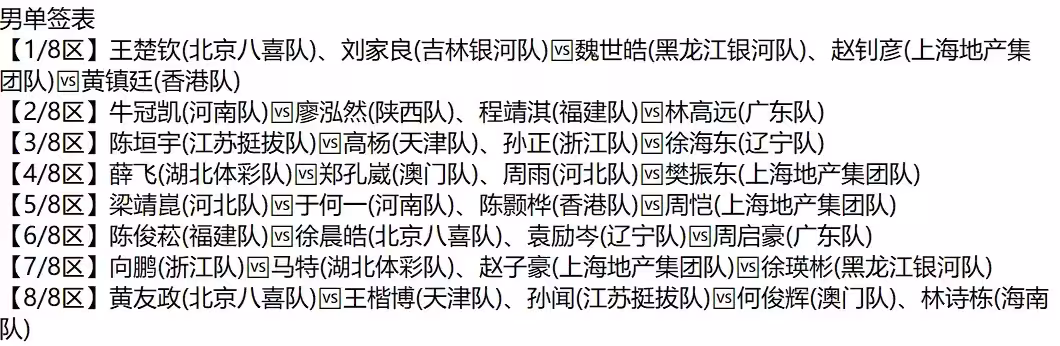 三號種子梁靖崑位於5/8區,首輪對戰河南隊於何一。而二號種子、海南隊新星林詩棟則鎮守下半區8/8區,首輪輪空。