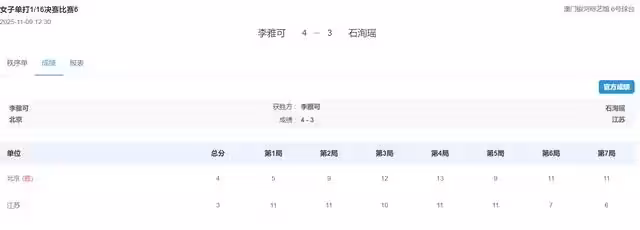 北京時間11月9日,全運會女單1/16決賽,北京隊的李雅可4-3逆轉江蘇隊的石洵瑤,七局比分:5-11,9-11,12-10,13-11,9-11,11-7,11-6。也就是說李雅可在大比分0-2落後的情況下扳成2-2,天王山還是李雅可拿到3-2反超,石洵瑤拿下第六局進入搶七,最終搶七石洵瑤崩盤。