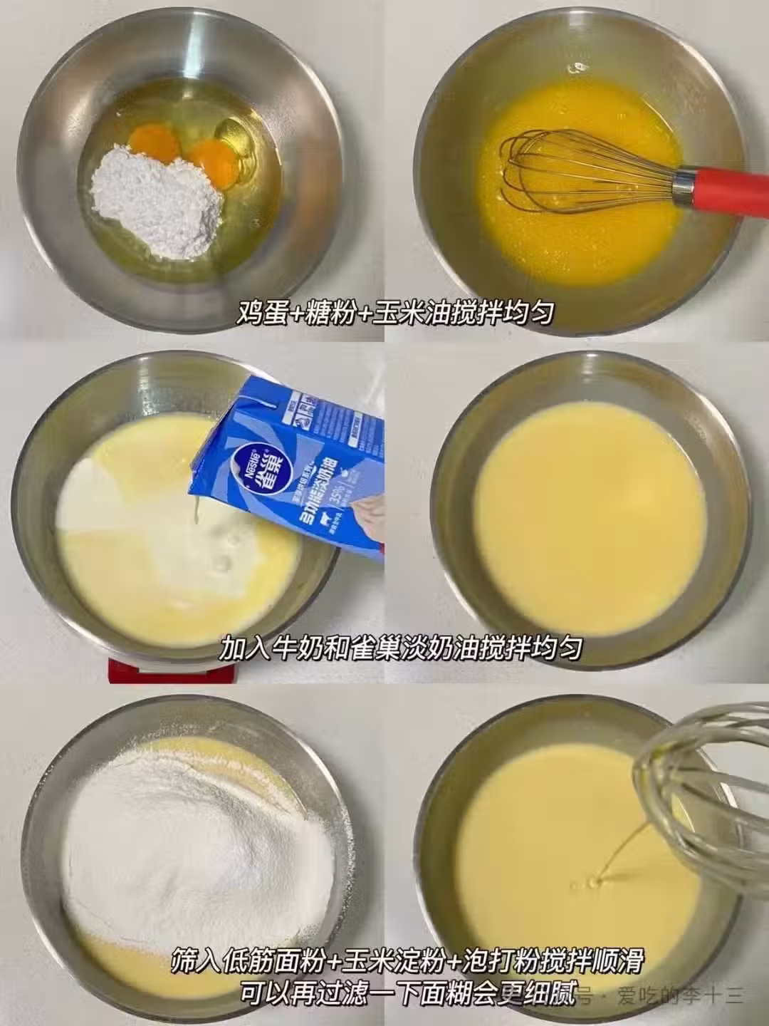 1. 雞蛋+糖+玉米油攪拌均勻,加入牛奶和淡奶油攪勻