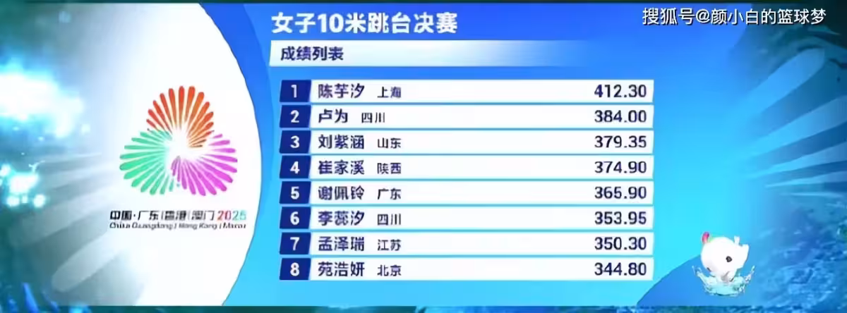 全運會女子10米台決賽,上海隊的陳芋汐以412.30分的成績斷崖奪冠,第二名的盧為384分,第三名的劉紫涵379.35分。