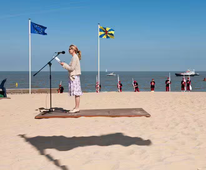 一位女士站在一塊木板上演講,木板在沙地上,而一塊旗幟的倒影剛好在木板的下方。