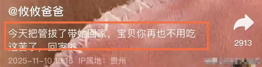 翻看攸攸爸爸的視訊帳號不難發現其「狠心」,她在10號的時候與妻子商量,將女兒賴以生存的「塑料管」拔掉,沒有多久後,攸攸便帶著遺憾離開了這個世界。