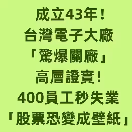 成立43年!台灣電子大廠「驚爆關廠」高層證實!400員工秒失業「股票恐變成壁紙....」